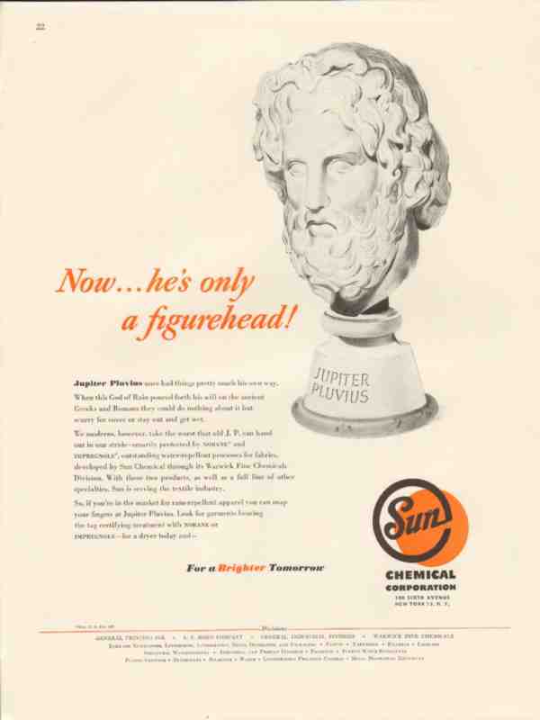 Original old water repellent industry trade magazine ad for SUN CHEMICAL CORPORATION of New York City, NY. Now He's Only a Figurehead! Jupiter Pluvius once had things pretty much his own way. When this God of Rain poured forth his will on the ancient Greeks and Romans they could do nothing about it but scurry for cover or stay out and get wet. Norane and Impregnole, outstanding water repellent processes for fabrics, developed by Sun Chemical through its Warwick Fine Chemicals Division. This 1947 magazine advertisement would display beautifully matted and framed.