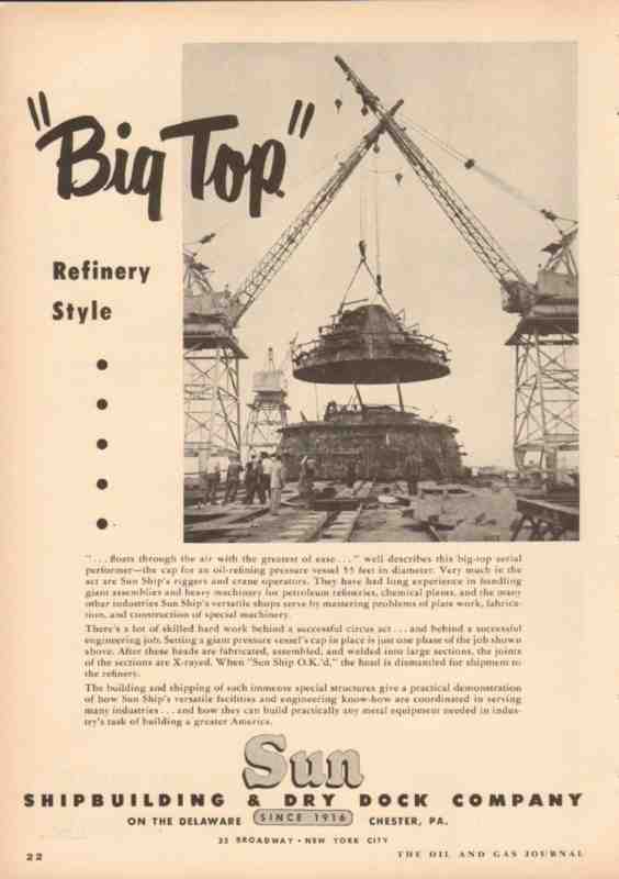 Original oil and gas trade magazine vintage ad for SUN SHIPBUILDING & DRY DOCK COMPANY, of Chester, PA. Big Top Refinery Style, floats through the air with the greatest of ease well describes this big-top aerial performer, the cap for an oil refining pressure vessel 55 feet in diameter. Very much in the act are the riggers and crane operators. They have had long experience in handling giant assemblies and heavy machinery for refineries, chemical plants and many other industries. This unique 1953 old petroleum refining process industry equipment magazine advertisement would display beautifully matted and framed.