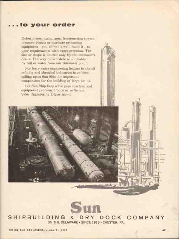 Original oil and gas trade magazine vintage ad for SUN SHIPBUILDING & DRY ROCK COMPANY, of Chester, PA. To Your Order. Processing Equipment, debutinizers, exchangers, fractionating towers, pressure vessels or intricate processing equipment, you name it, we'll build it. This unique 1962 old petroleum refining industry equipment magazine advertisement would display beautifully matted and framed.