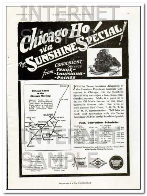 Original vintage oil and gas magazine ad for THE SUNSHINE SPECIAL. The Official Route to the Chicago Meeting of the American Petroleum Institute Convention. Convenient train service form Texas and Louisiana. Ride the Rail in the Oil Men's Section of the train. Old dated 1927 petroleum industry advertisement. Would display magnificently matted and framed!