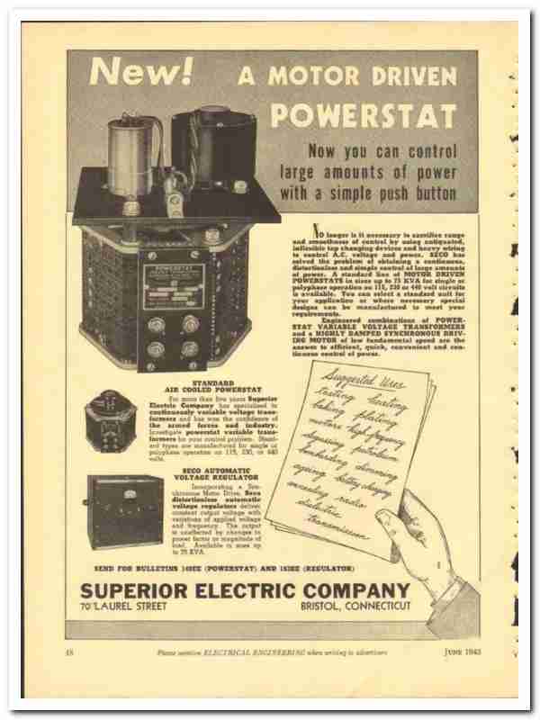 Superior Electric Company 1943 vintage ad Powerstat voltage regulator