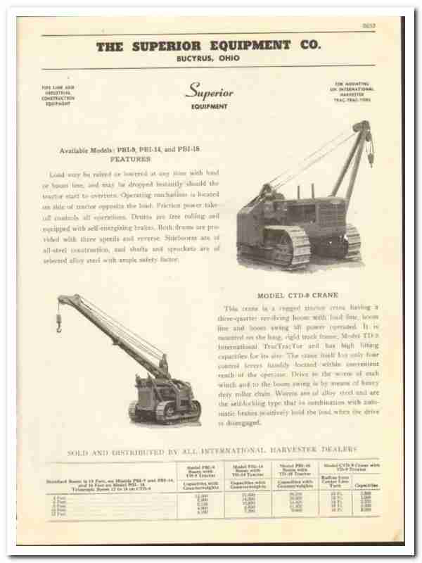 Products include Model PBI-9, PBI-14 and PBI-18 as loads may be raised and lowered at any time with load or boom line and may be dropped instantly should the tractor start to overturn. Also shown and featured is the Model CTD-9 Crane, a rugged tractor having a three-quarter revolving boom with load line, boom line and boom swing all power operated. It is mounted on the long, rigid track frame, Model TD-9 International TracTracTor and has high lifting capacities for its size...