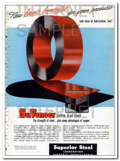 Original vintage industrial magazine ad for SUPERIOR STEEL CORPORATION of Carnegie, PA. New Basic Benefits for Your Products, New Ease of Fabrication too! SuVeneer Copper Clad Strip. the Strength of Steel Plus Many Advantages of Copper. Old 1948 metal industry advertisement.
