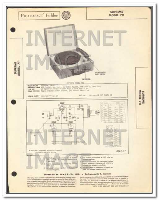 Vintage SUPREME model 711 3 tube amplified phonograph record player. Original old Sams Photofact manual includes schematic, layouts, alignment info, repair parts list. 2 pages. Dated 1949. Aim Industries, of New York, NY.