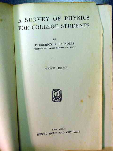Hard covered book titled A SURVEY OF PHYSICS FOR COLLEGE STUDENTS by Frederick Sounders, Professor of Physics, Harvard University, Revised Edition, 1936. 679 pages.