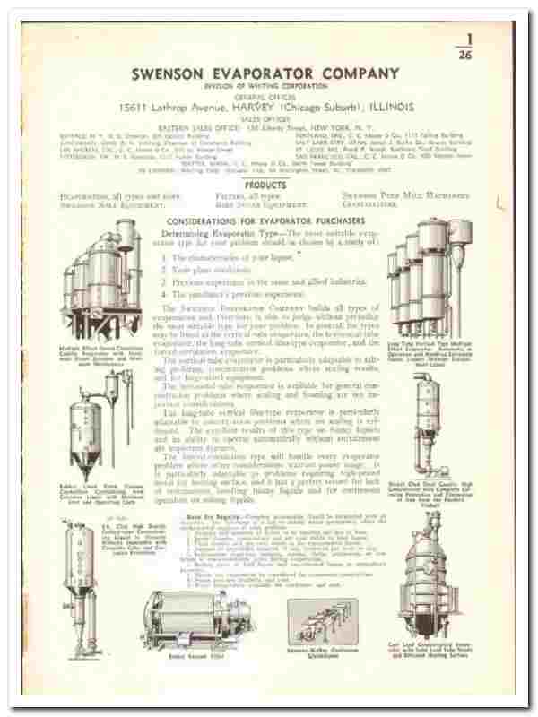 Original 1939 industrial trade vintage catalog for the SWENSON EVAPORATOR COMPANY. (Division of Whiting Corp). Main office and plant were located at 15611 Lathrop Avenue, Harvey, IL. (Chicago suburb).