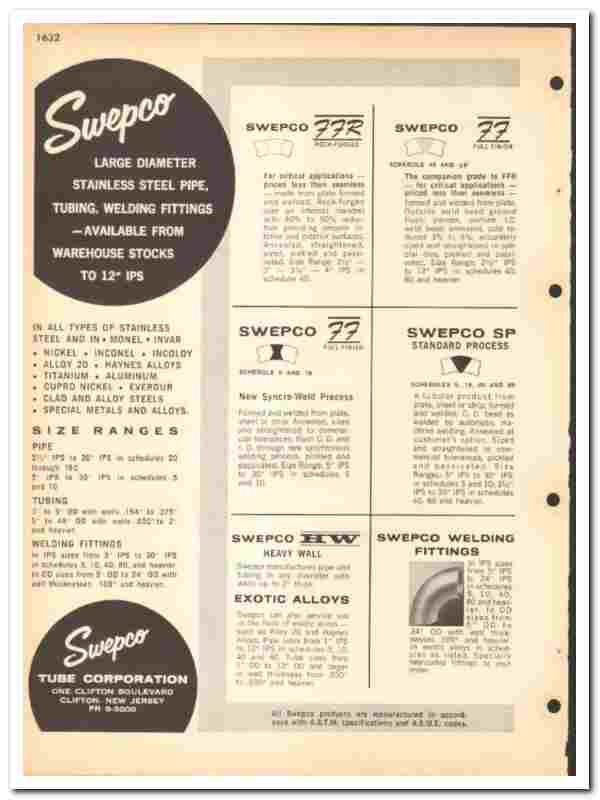 Original 1964 industrial trade vintage catalog for the SWEPCO TUBE CORPORATION. Main office and plant were located at One Clifton Blvd, Clifton, NJ.