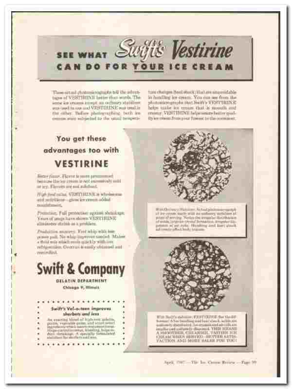 Swift Company 1947 vintage ice cream ad Vestirine stabilizer