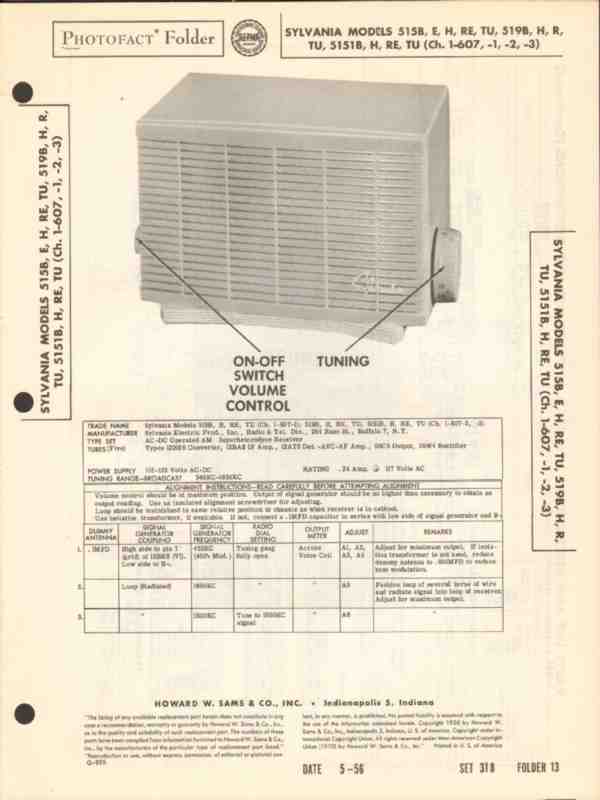 Vintage SYLVANIA models 515B, 515E, 515H, 515RE, 515TU, 519B, 519H, 519R, 519TU, 5151B, 5151H, 5151RE and 5151TU (chassis 1-607, 1-607-1, 1-607-2 and 1-607-3 5 tube Superheterodyne AM radio receiver. Original old Sams Photofact manual includes schematic, layout, alignment instructions, voltage & resistance test chart, repair parts list and description. 4 pages. Dated 1956. This manual would make a sensational accompaniment to your classic radio equipment.