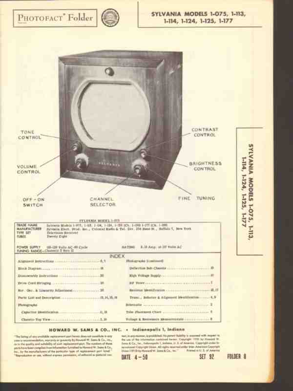 Vintage SYLVANIA model 1-075, 1-113, 1-114, 1-124, 1-125 and 1-127 TV television receiver. Original old Sams Photofact manual includes schematic, layout, alignment info, voltage & resistance test charts, repair parts list. 20 pages. Dated 1950. Sylvania Electic Products, Inc., Colonial Radio & Television Div. of Buffalo NY. This manual would make a sensational accompaniment to your vintage audio equipment.