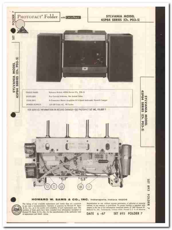 Vintage SYLVANIA model 45P84 Series (Chassis P03-5). AC operated 6-transistor stereo amplifier with 4 speed automatic record changer. Original old Sams Photofact manual includes schematic, parts layout, repair parts list and description. 6 pages. Dated 6-1967. This manual would make a sensational accompaniment to your retro phonograph equipment.