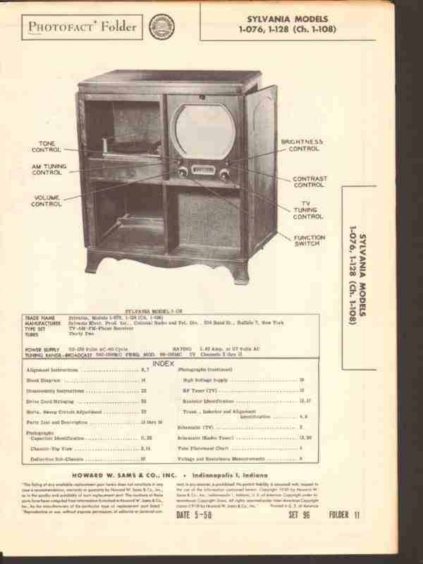 sylvania models 1-076 128 tv television receiver sams photofact manual