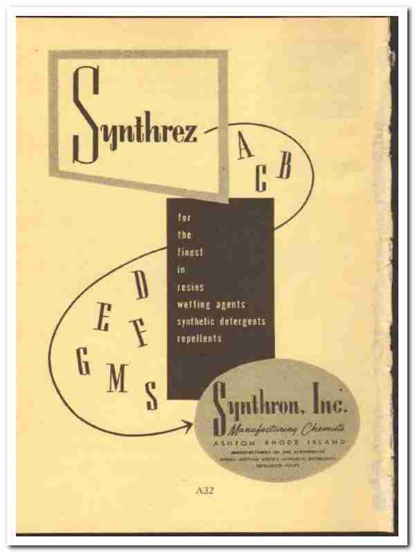 Original 1952 textile chemical trade vintage ad for SYNTHRON, INC. Main office and plant was located in Ashton, RI.