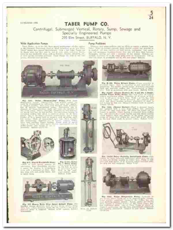 Original 1939 industrial trade vintage catalog for the TABER PUMP COMPANY. Main office and plant were located at 295 Elm Street, Buffalo, NY.