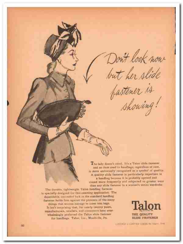 Original 1946 handbag zipper manufacturing trade magazine vintage ad for TALON, INC. Main office and factory was located in Meadville, PA. Don't look now but her slide fastener is showing! Its a Talon slide fastener and no item used in handbags, regardless of cost, is more universally recognized as a symbol of quality. A quality slide fastener is particulary important in a handbag because it is probably opened and closed more frequently and subjected to greater wear than any slide fastener in a womans entire wardrobe. This old dated one page post-war magazine advertisement would display beautifully matted and framed.