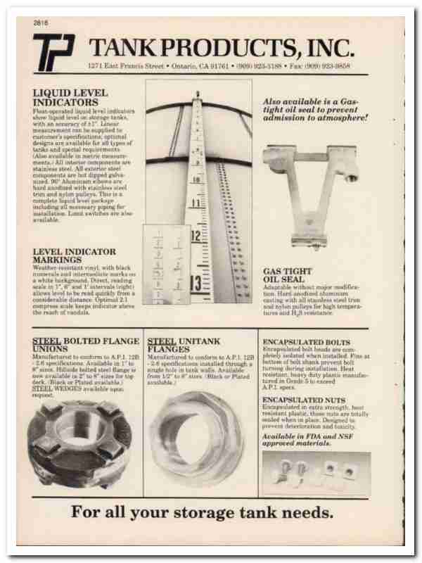 Original 1994 Oil and Gas trade vintage catalog for TANK PRODUCTS, INC. Main office and plant was located at 1271 East Francis Street, Ontario, CA.