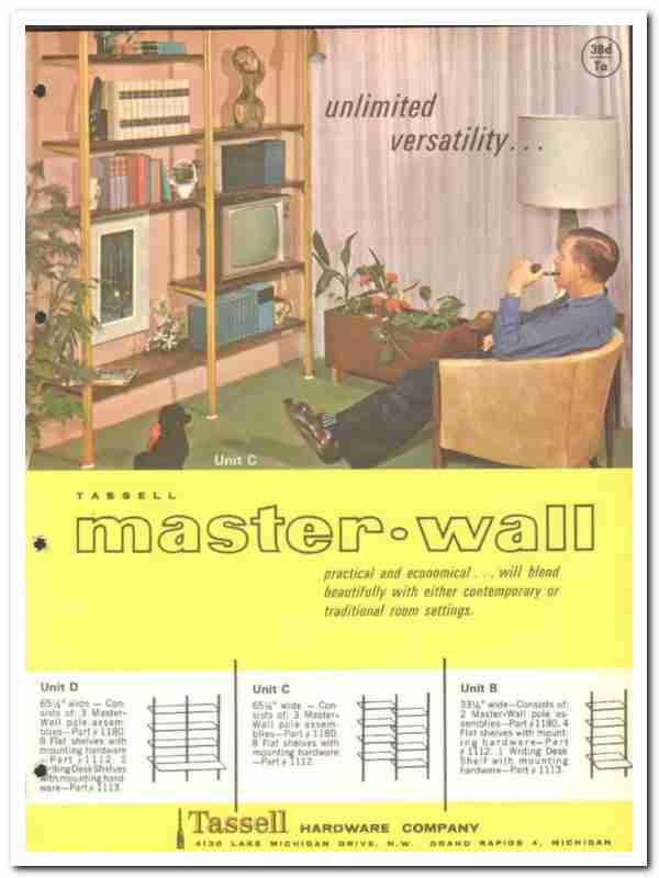 Original shelving trade vintage catalog for TASSELL HARDWARE COMPANY. Main office was located at 4135 Lake Michigan Drive NW, Grand Rapids, MI. Manufacturers of Master-Wall shelving for den or office. Pictured are Units C, E, F and G. Practical and economical. Will blend beautifully with either contemporary or traditional room settings. Unbound from a large 1964 architectural catalog, this unique old four page technical brochure would display beautifully matted and framed. A marvelous addition to your retro storage equipment. Pages are detached and contain a small amount of residual glue on edge.
