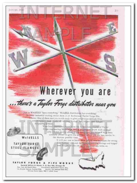 Original vintage industrial magazine ad, for TAYLOR FORGE AND PIPE WORKS of Chicago, IL. Wherever you are, There's a Taylor Forge Distributor Near Your. Weldells Taylor Forge, Steel Flanges. Old dated 1948 industry advertisement.
