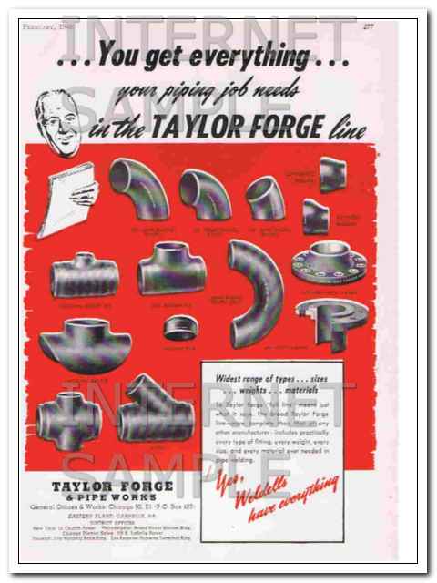 Original vintage industrial magazine ad, for TAYLOR FORGE AND PIPE WORKS of Chicago, IL. You Get Everything Your Piping Job Needs in the Taylor Forge Line. Long Radius Weldell, Concentric Reducer, Outlet Tee, Welding Cap, Welding Saddle, Cross, Lateral. Old 1948 dated industry advertisement.
