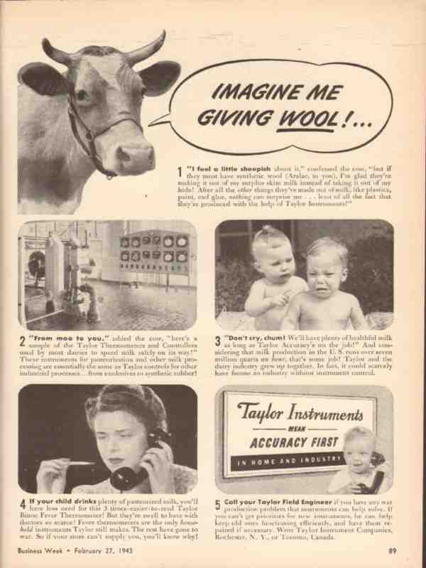 Original World War 2 business industry trade magazine vintage ad for TAYLOR INSTRUMENT COMPANIES of Rochester, NY. Imagine Me Giving Wool! Aralac Synthetic Wool. From moo to you. Taylor Thermometers and Controllers, Taylor Binoc Fever Thermometer. Old 1943 WW2 wartime era propaganda magazine advertisement.