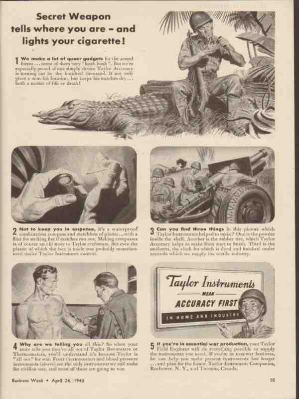 Original World War 2 business industry trade magazine vintage ad for TAYLOR INSTRUMENT COMPANIES of Rochester, NY. Secret Weapon Tells Where You Are, and Lights Your Cigarette! It's a waterproof combination compass and matchbox of plastic with flint for striking fires. Old 1943 WW2 wartime era propaganda magazine advertisement.