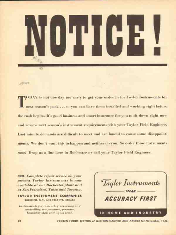 Original vintage food packing trade magazine ad for TAYLOR INSTRUMENT COMPANY of Rochester, NY. Notice! Get your Order in for Taylor Food Service Instruments for Next Season's Pack. Instruments for indicating, recording and controlling temperature, pressure, humidity, flow and liquid level. Old 1946 process and packaging advertisement.