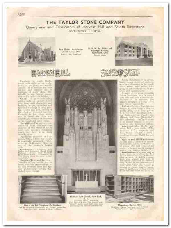Original stone trade vintage catalog for THE TAYLOR STONE COMPANY. Was located in McDermott, OH. Quarry of Harvest Hill and Sciota Sandstone. Furnished in rough blocks, sawed, split ashlar or cut ready to set. It is suitable for both interior and exterior use in buildings of every class. Used in First United Presbyterian Church, Akron, OH. Ralph Orr, Architect, and at the Heavenly Rest Church, New York City, NY. Goodhue Associates, Architects. Unbound from a large 1933 architectural catalog, this unique old one page technical brochure would display fantastic matted and framed. Nice graphics. A fabulous addition to your retro stone library. Slight damp stain on page edges.
