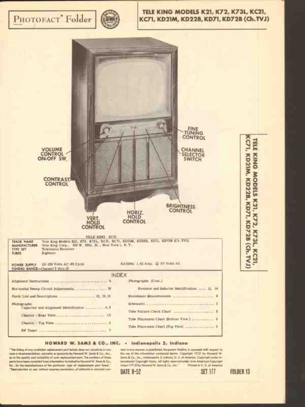 Vintage TELE KING model K21, K72, K73L, KC21, KC71, KD21M, KD22B, KD71 and KD72B (Ch. TVJ) 18 tube TV television receiver. Original old Sams Photofact manual includes schematic, layout, alignment instructions, voltage & resistance test chart, repair parts list. 16 pages. Dated 1952. Tele King Corp., of New York, NY. This manual would make a sensational accompaniment to your classic video TV equipment.