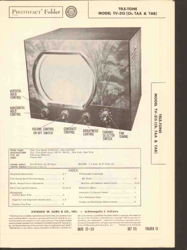 tele-tone model tv-315 tv television receiver sams photofact manual