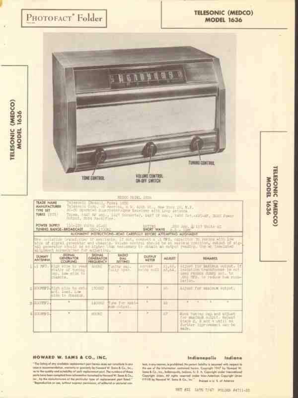 Vintage TELESONIC model 1636 6 tube AM radio receiver AC-DC operation. Original old Sams Photofact manual includes schematics, layouts, alignment adjustments, parts list. 4 pages. Dated 1947. Telesonic Corp. of New York, NY. This manual would make a sensational accompaniment to your vintage audio equipment.