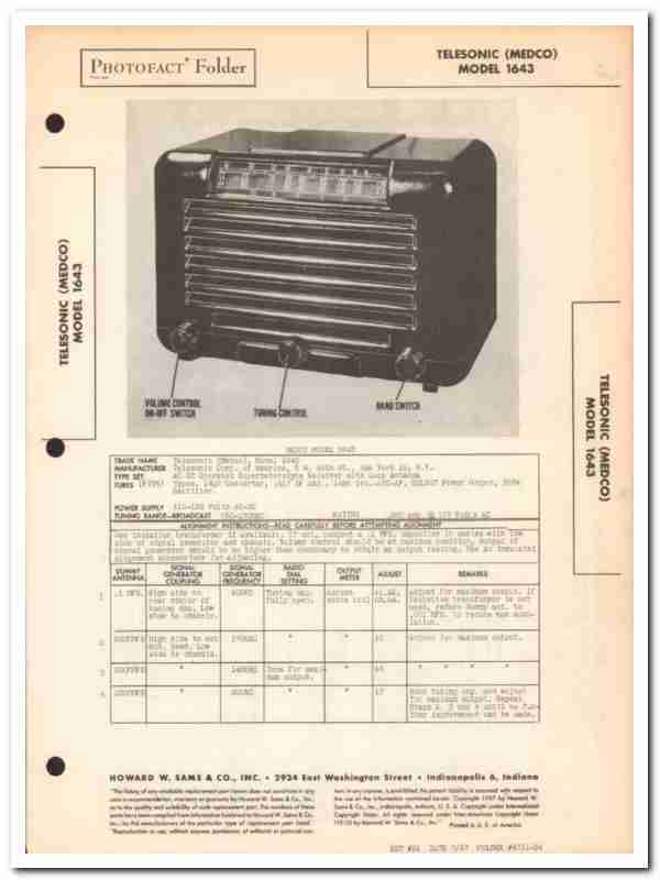 Vintage Radio Service Manual - TELSONIC (Medco) model 1643 5-tube Superheterdyne AM radio receiver. Manufactured by Telsonic Corporation of America, of New York, NY. Dated 1947. 4 pages. Original old Sams Photofact manual includes schematic, layout, alignment instructions, voltage & resistance test chart, repair parts list and description. This manual would make a sensational accompaniment to your retro audio equipment.