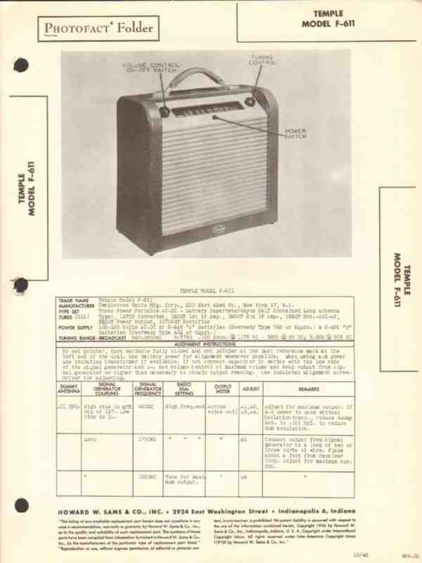 Vintage TEMPLE model F-611 Superheterodyne 6 tube portable AM radio receiver. Original old Sams Photofact manual includes schematic, layout, alignment instructions, voltage & resistance test charts, repair parts list and description. Dated 1946. 4 pages. Templetone Radio Manufacturing Corp. of New London, CT. This manual would make a sensational accompaniment to your classic retro radio equipment.