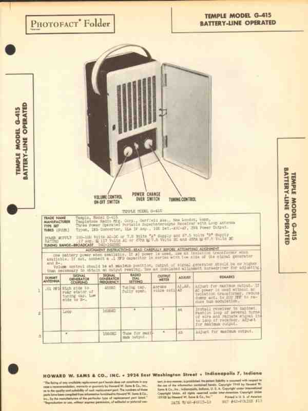 Vintage TEMPLE model G-415 portable Superheterodyne AM radio receiver. Original old Sams Photofact manual includes schematics, layouts, alignment, adjustments, repair parts list. 4 pages. Dated 1948. Templtone Radio Manufacturing Corp. of New London, CT. This manual would make a sensational accompaniment to your vintage audio equipment.