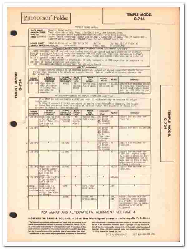 Vintage Radio Service Manual - TEMPLE model G-724 7-tube Superheterodyne AM FM radio receiver. Manufactured by Templetone Radio Manufacturing Company, of New London, CT. Dated 1948. 6 pages. Original old Sams Photofact manual includes schematic, layout, alignment instructions, dial cord drive, voltage & resistance test chart, repair parts list and description. This manual would make a sensational accompaniment to your retro audio equipment.