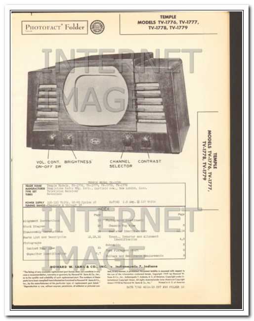 Vintage TEMPLE models TV-1776, TV-1777, TV-1778 and TV-1779 17 tube Television receiver. Original old Sams Photofact TV manual includes schematic, layouts, alignment info, voltage test charts, repair parts list. 16 pages. Dated 1949. Templtone Radio Manufacturing Corp. of New London, CT. This manual would make a sensational accompaniment to your vintage video equipment.