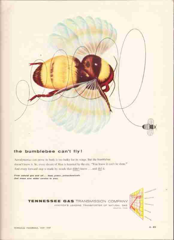 Original oil and gas trade magazine vintage ad for TENNESSEE GAS TRANSMISSION COMPANY. Main office was located in Houston, Texas. America's Leading Transporter of Natural Gas. The Bumblebee can't Fly. From natural gas and oil - heat, power, petrochemicals that mean ever wider service to man. This unique 1959 old petroleum gas pipeline industry magazine advertisement would look sensational matted and framed. Great graphics.