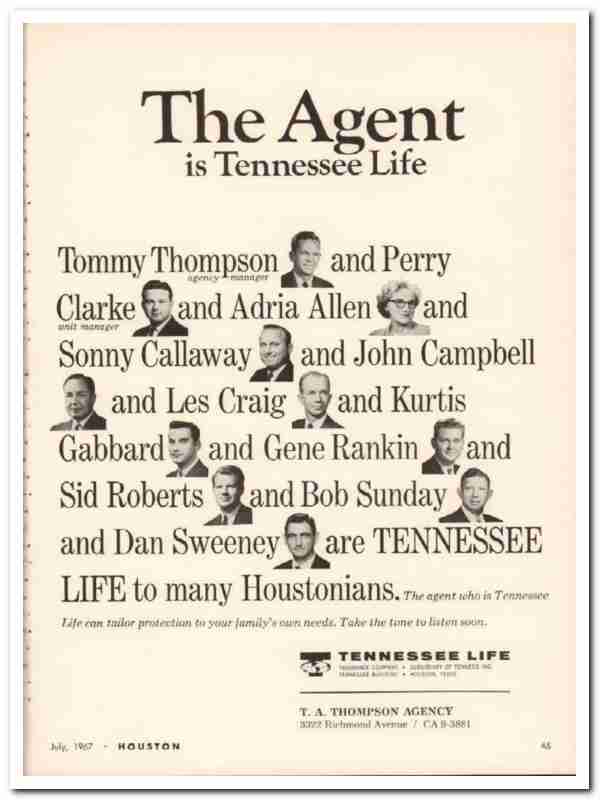 Original 1967 Houston business trade magazine vintage ad for the TENNESSEE LIFE INSURANCE COMPANY. Subsidiary of Tenneco, Inc. T. A. Thompson Agency. Main office was located at 3322 Richmond Avenue, Houston, Texas. Tommy Thompson, agency manager, and Perry Clark, unit manager and Adria Allen and Sonny Callaway and John Campbell and les Craig and Kurtis Gabbard and Gene Rankin and Sid Roberts and Bob Sunday and Dan Sweeney are Tennessee Life to many Houstonians. This old dated one page insurance magazine advertisement would display beautifully matted and framed.