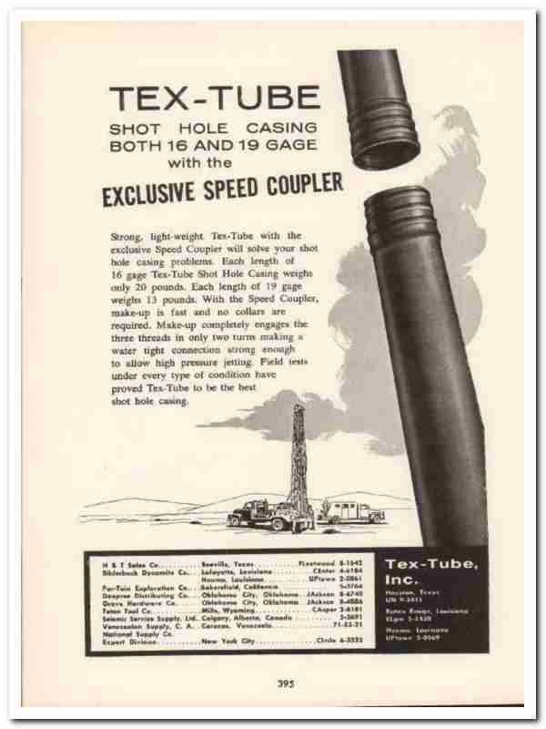 Original oil and gas trade magazine vintage ad for TEX-TUBE, INC. Main office and plant was, and still is located at 1503 North Post Oak Road, Houston, Texas. Also located in Baton Rouge, LA, and Houma, LA. Tex-Tube shot hole casing, both with 16 and 19 gage with the exclusive speed coupler. This unique 1958 old petroleum oilfield drilling pipe and pipeline industry equipment magazine advertisement would display beautifully matted and framed.