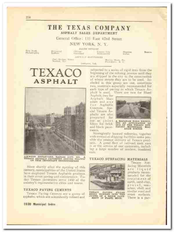 Products include Texaco Paving Cements, Texaco Surfacing Materials, Resurfacing Worn-Out Pavements and Texaco Cold Patch, all are fully featured.