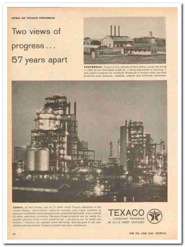 Original oil and gas trade magazine vintage ad for THE TEXAS COMPANY. Views of Progress of the Texaco refinery in Port Arthur, TX, 57 years apart. Ultra-modern chemical wizardry uses many methods to produce constantly improved gasoline, perfected lubricants, and a myriad of other petroleum products. This unique 1959 old petroleum products refining process industry magazine advertisement would display beautifully matted and framed.