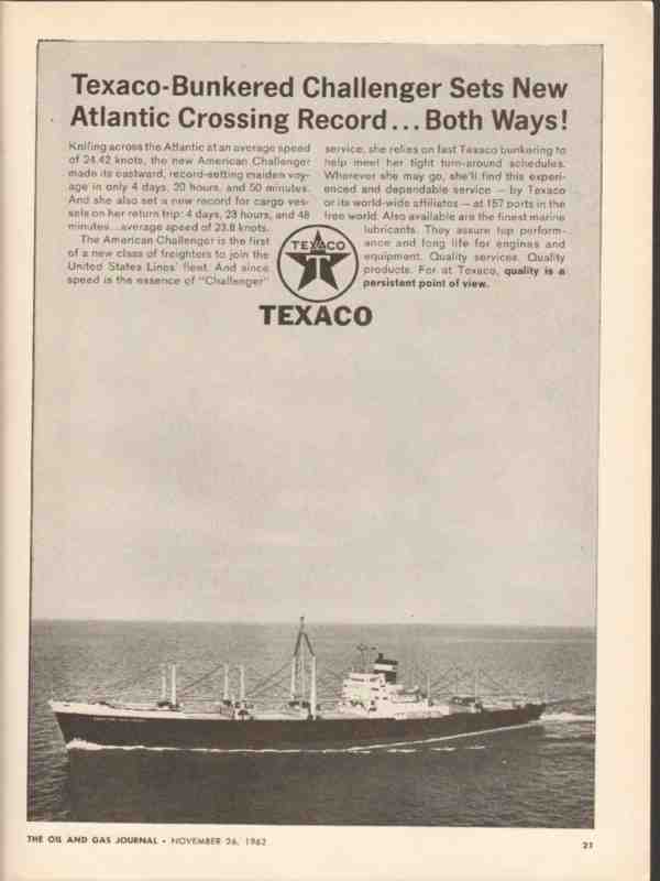Original oil and gas trade magazine vintage ad for THE TEXAS COMPANY. Texaco Bunkered Challenger Sets New Atlantic Crossing Record, Both Ways! The American Challenger is the first of a new class of freighters to join the United States Lines' fleet. This unique 1962 old petroleum products transportation industry magazine advertisement would display beautifully matted and framed.