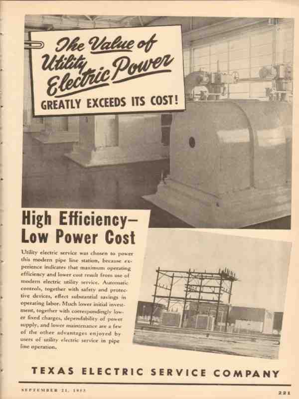 Original oil and gas trade magazine vintage ad for TEXAS ELECTRIC SERVICE COMPANY. The Value of Utility Electric Power, High Efficiency, Low Power Cost. This unique 1953 petroleum oilfield power magazine advertisement would display beautifully matted and framed.