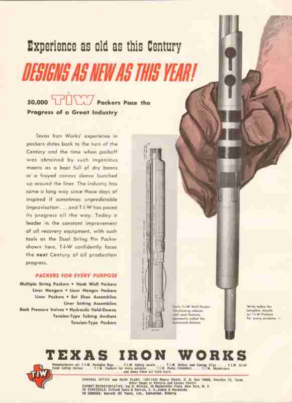 Original oil and gas trade magazine vintage ad for TEXAS IRON WORKS, of Houston, TX. Experience as old as the Century, Designs as new as the Year!. PACKERS FOR EVERY PURPOSE. Portable Rigs, Safety Joints, Rotary and Casing Slips, Grief Stem Safety Valves, Pump chambers, Mud mixers, and other oil field tools. This unique 1959 old petroleum oilfield drilling industry equipment magazine advertisement would look sensational matted and framed.