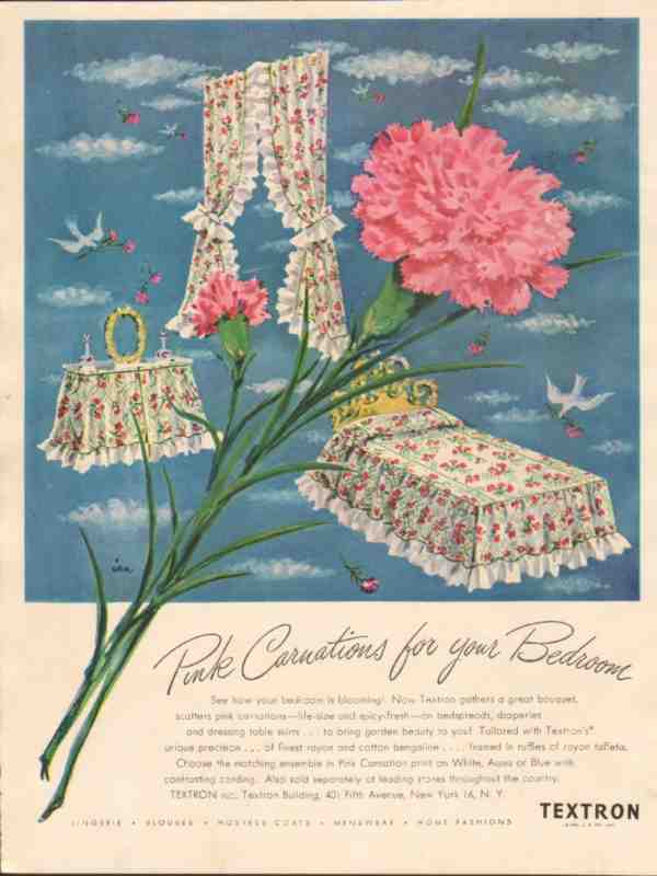 textron inc 1946 pink carnations bedroom bedspread curtains vintage ad