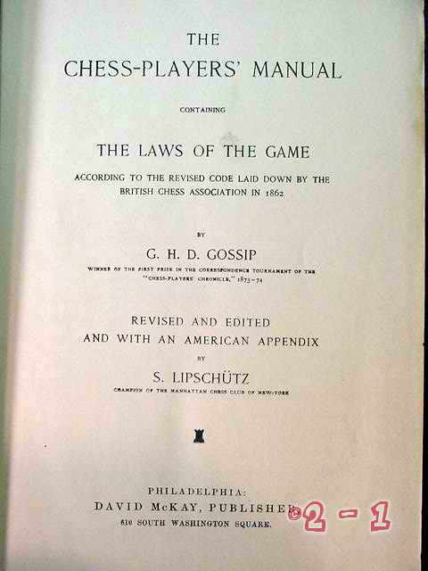 Hard covered book titled THE CHESS PLAYER'S MANUAL The Laws of The Game, According to the Revised Code layed down by the British Chess Association in 1862, by G.H.D. Gossip, 1902. Published by David McKay. 884 pages plus 120 appendix.
