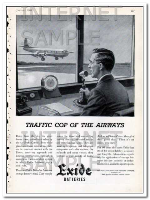 Original vintage industrial magazine ad, for THE ELECTRIC STORAGE BATTERY COMPANY of Philadelphia, PA. Traffic Cop of The Airways. Down from the sky the great liners come, guided with safety by the Air Traffic control. Even while planes are many miles away, pilots agree in constant contact with the Tower, receiving approach and landing instructions through a marvelous communication system in which Exide Batteries play a vital role. Old dated 1948 industry advertisement.