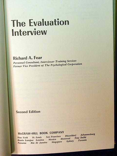 Hard covered book titled THE EVALUATION INTERVIEW by Richard Fear, 1973, 2nd Edition. 320 pages.