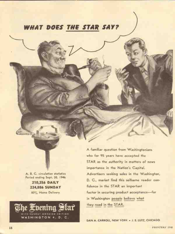 Original vintage media trade magazine ad for THE EVENING STAR Newspaper of Washington, D.C. What Does The Star Say? People Believe What They Read in The Star.Art signed by Gibson "Gib" Crockett. Dan A Carroll, NY. J.E. Lutz, Chicago, IL. Old 1947 magazine advertising industry advertisement, would display beautifully matted and framed.