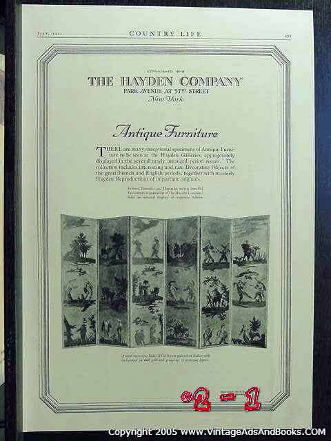 Original vintage furniture magazine ad for THE HAYDEN COMPANY. Was located on Park Avenue at 57th Street, New York City, NY. Antique Furniture. A most interesting Louis XVth Screen painted on leather with background in dull gold and grouping of grotesque figures. Old 1922 magazine advertisement.