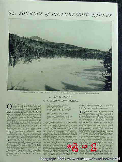 Original vintage magazine article, The Sources of Picturesque Rivers THE HUDSON by T. Morris Longstreth. . Mount Marcy, Lake Tear of the Clouds, Hudson River, New York. Pictured is: Lake Tear of the Clouds, from which flows the Hudson with the summit of Marcy in the distance, The headwaters of the Hudson River near the Tahawus Club with the shoulder of Adams Mountain in the background, Looking south from the summit of Indian Pass. Old 1922 magazine article. 2 pages.